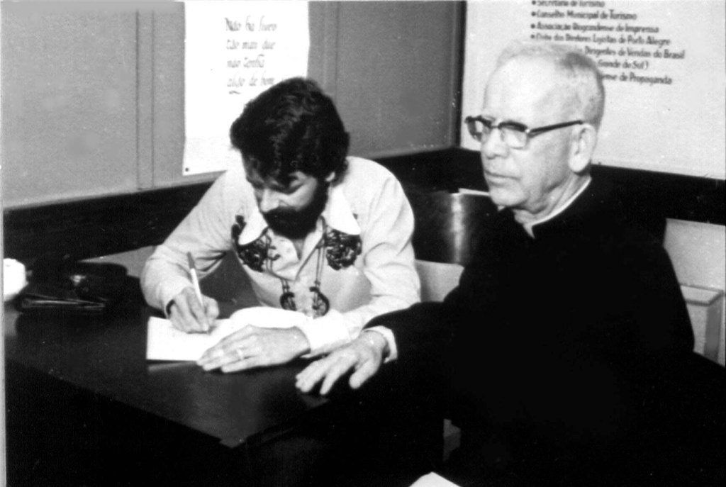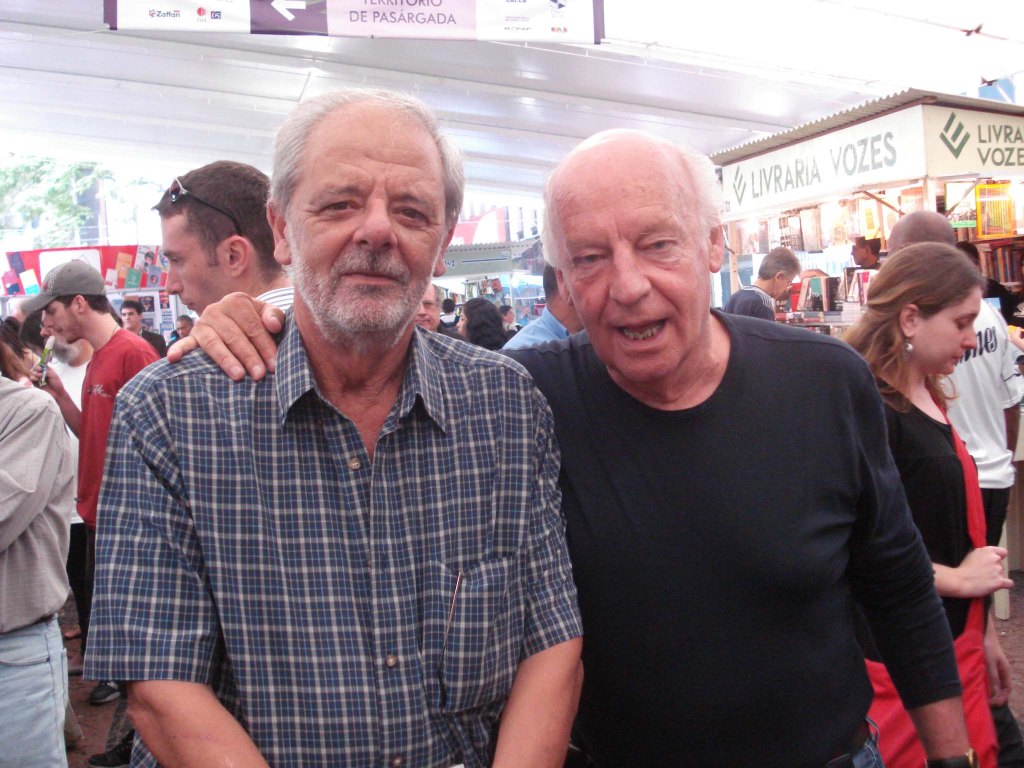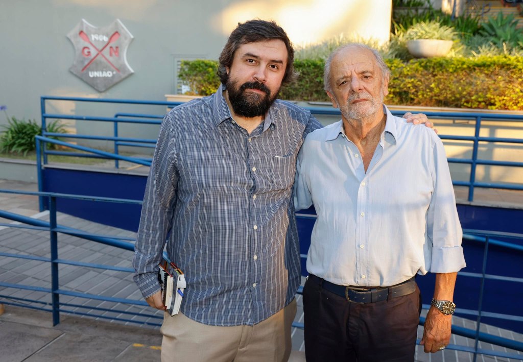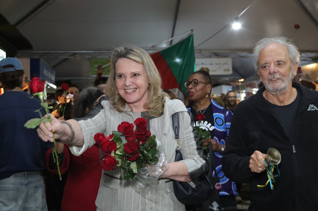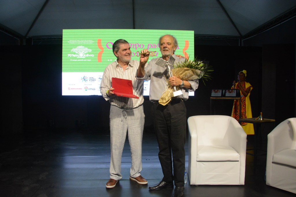 Em 2024, o Patrono da 70ª Feira do Livro de Porto Alegre recebe a chave do evento das mãos do patrono anterior, o romancista e cineasta Tabajara Ruas. Foto de Ricardo Giusti.